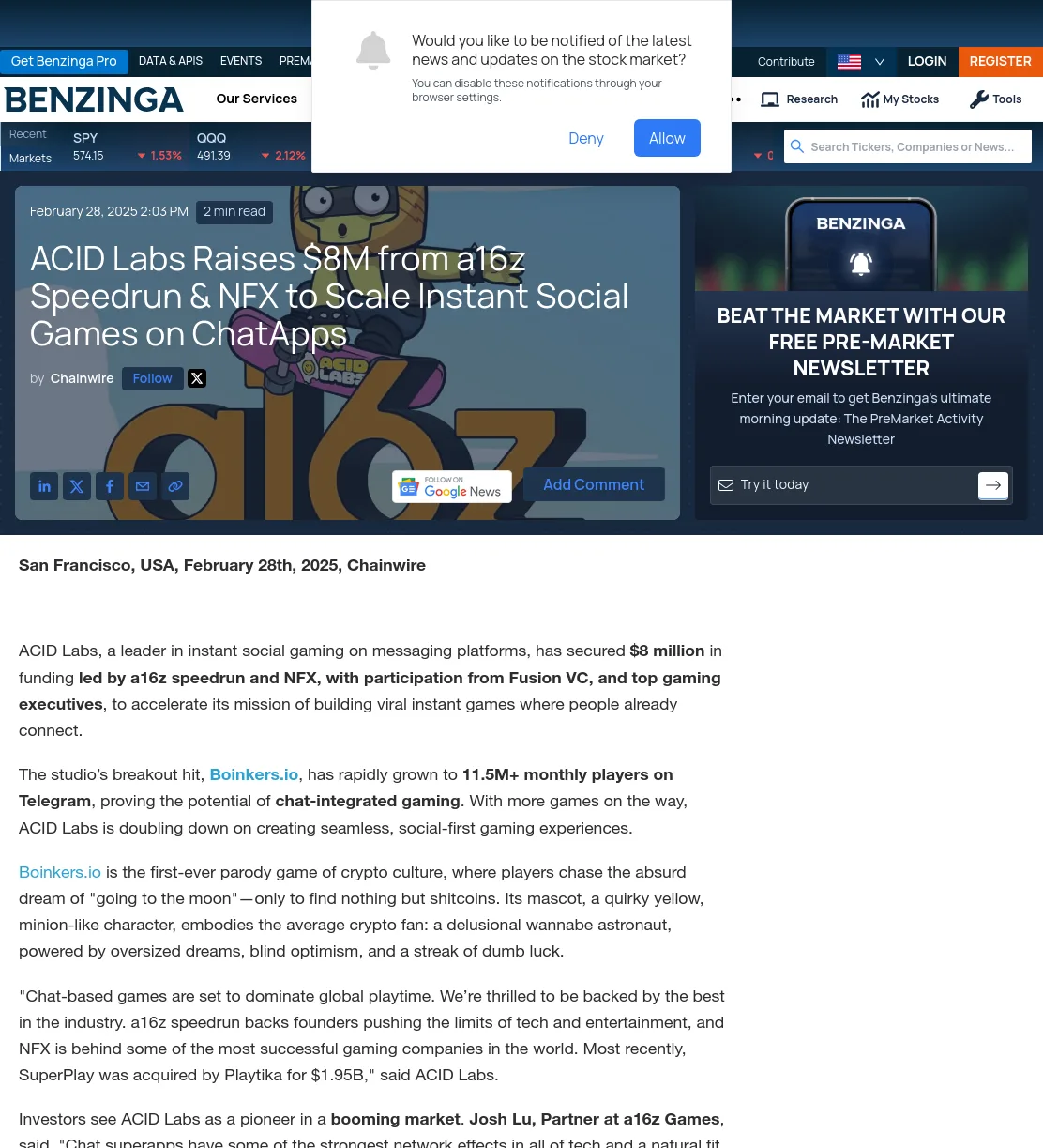 In early 2025 , Acid Labs, a rising Web gaming studio, secured an $million funding round co-led by Andreessen Horowitz's Speedrun(az) and NFX. The company's mission was to build viral Web gameson social chat platforms, essentially bringing blockchain-based gamesinto popular messaging apps where users already connect.Acid Labs had already proven this concept with a breakout hit game,Boinkers.io, which amassed over million players on Telegram. This combination of high-profile investors and a visionaryproduct created a compelling story. The challenge nowwas to amplify that story: Acid Labs turned to The PRG tomake sure their fundraising success and innovative visiongained the widespread recognition it deserved, all withina short two-month campaign window.
